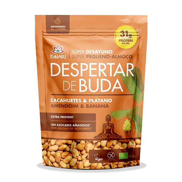 O Despertar de Buda Amendoim e Banana é uma mistura sem glúten, sem adição de açúcar e de fácil digestão, que tem como base o trigo-sarraceno. Fácil de preparar e de incorporar na alimentação do dia-a-dia, basta juntar água ou bebida vegetal para obter um porridge. Esta mistura combina diferentes ingredientes de elevado valor nutricional como o trigo-sarraceno, a farinha de amendoim e banana em pó. Uma excelente fonte de proteína, fibra, ácidos gordos essenciais e minerais.